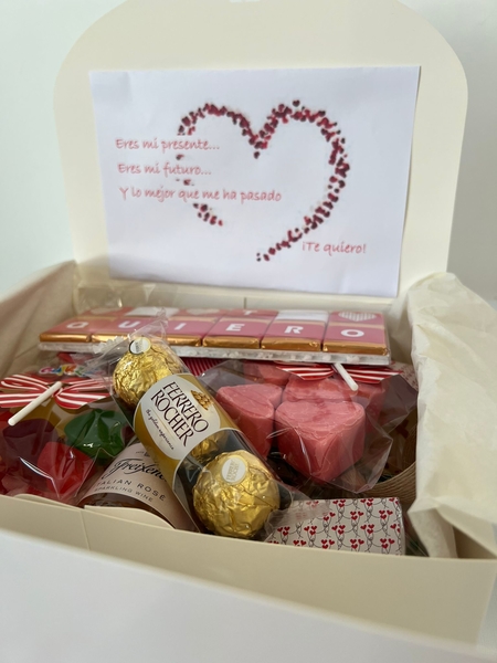 - Incluye una caja roja de chocolates, globo, y una tarjeta personalizada.