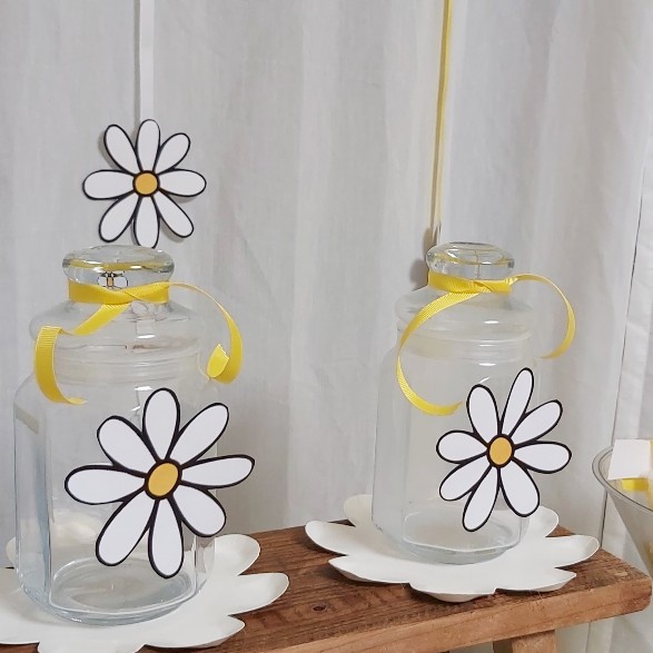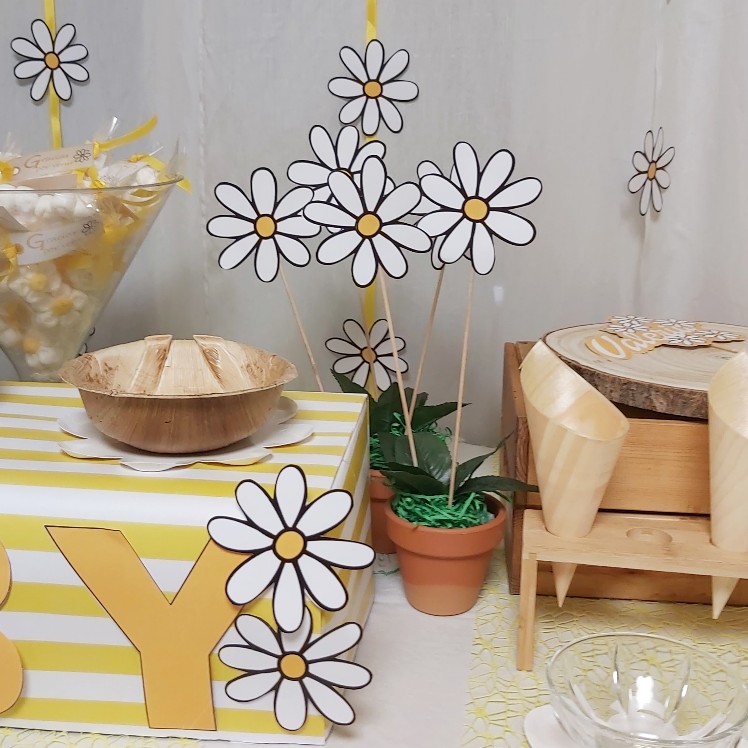 Decidimos que la temática principal del Baby Shower serían las margaritas. Estas flores, con sus colores vibrantes, eran la elección perfecta para dar vida al candy bar y a toda la mesa de aperitivos. Optamos por decorar con globos amarillos y blancos para crear un ambiente festivo y luminoso. Además, utilizamos accesorios y cajas de madera para mantener la coherencia con el tema de las margaritas.