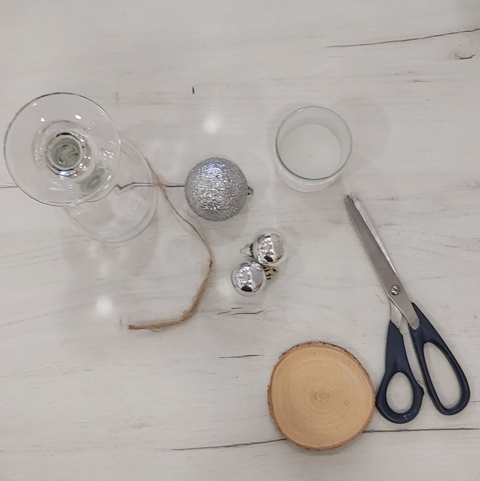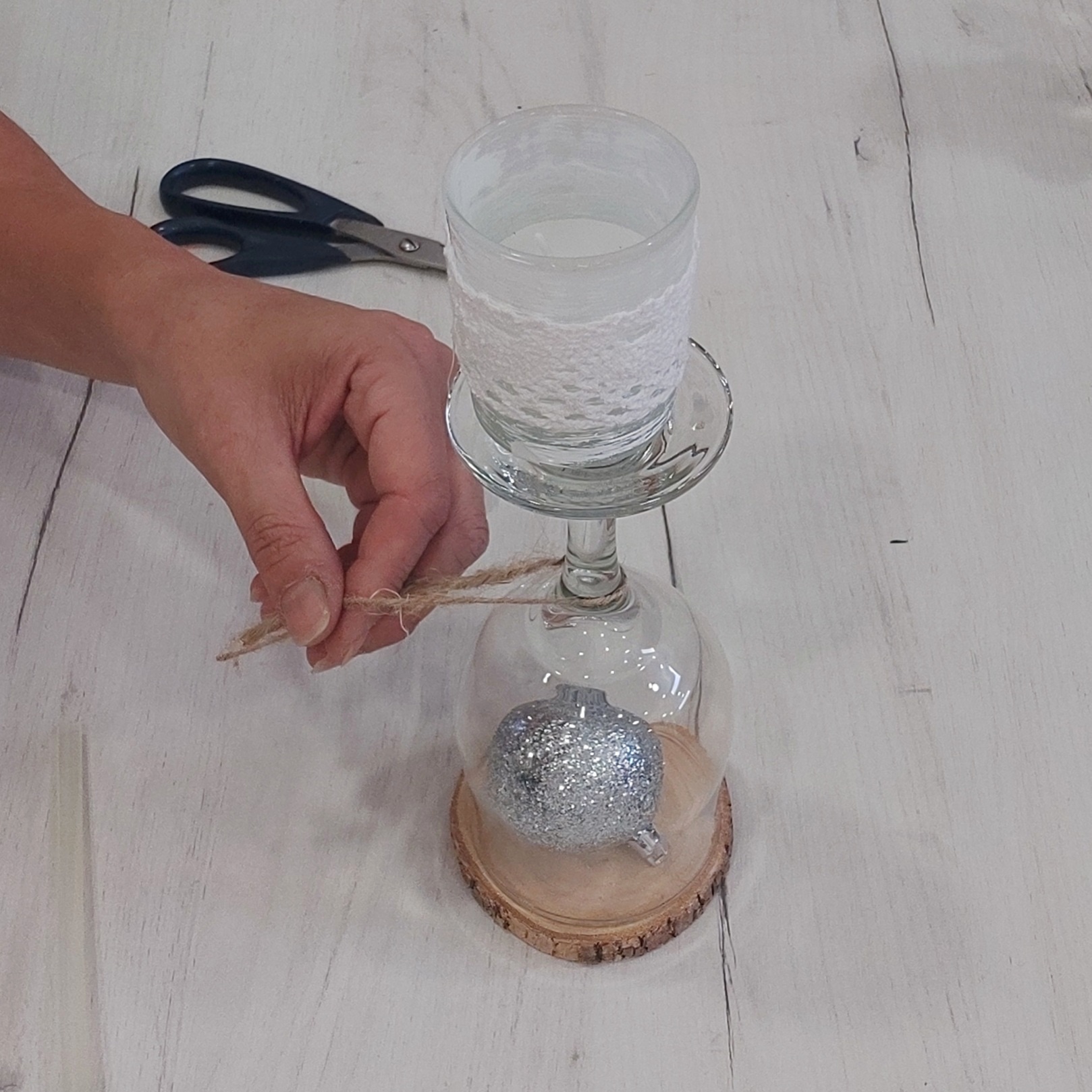 - Paso 4: Para completar el aspecto, ata las dos bolas de Navidad pequeñas alrededor del cuello de la copa utilizando la cuerda. Esto añade un toque de color y diversión a tu centro de mesa.