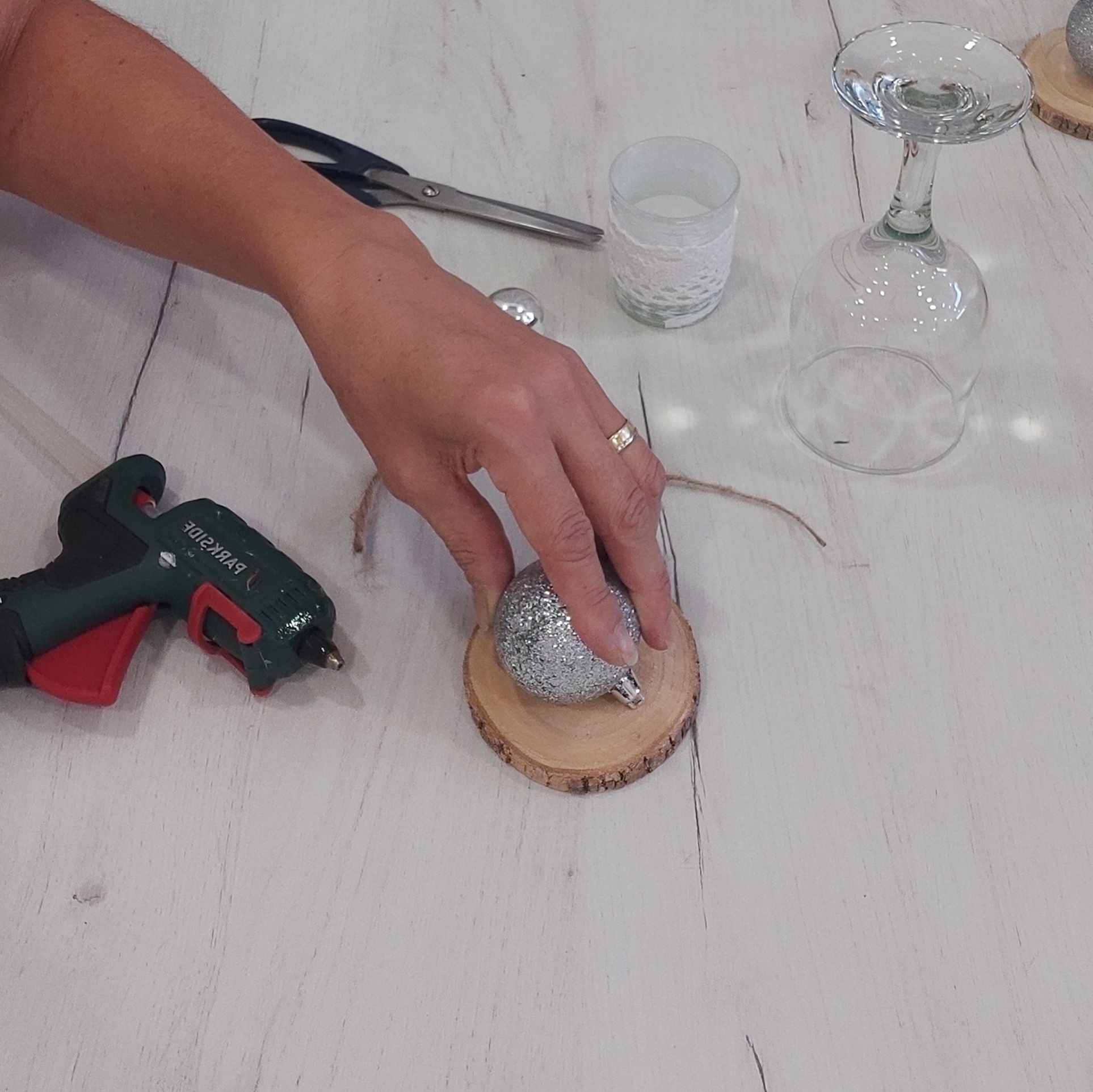 - Paso 1: Comienza pegando la bola de Navidad de 4 centímetros a la base redonda utilizando la pistola de silicona. Asegúrate de que esté firmemente fijada en su lugar, ya que será la base de tu centro de mesa.