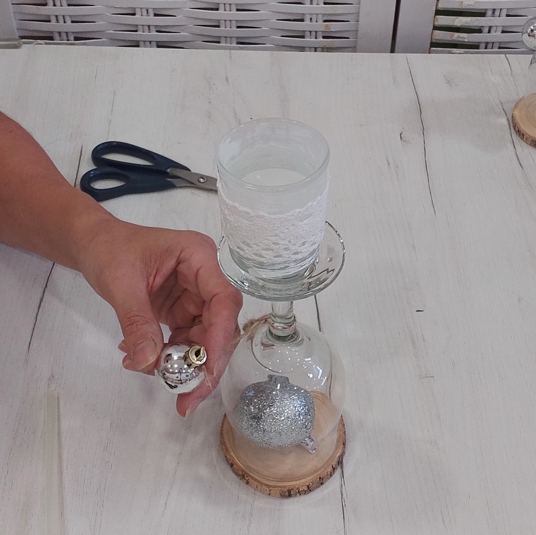 - Paso 2: Cubre la bola con la copa, asegurándote de que la copa esté boca abajo. Pégalas juntas en la base de madera para crear el efecto de una campana invertida. Esto añade un toque de elegancia y singularidad a tu mesa.