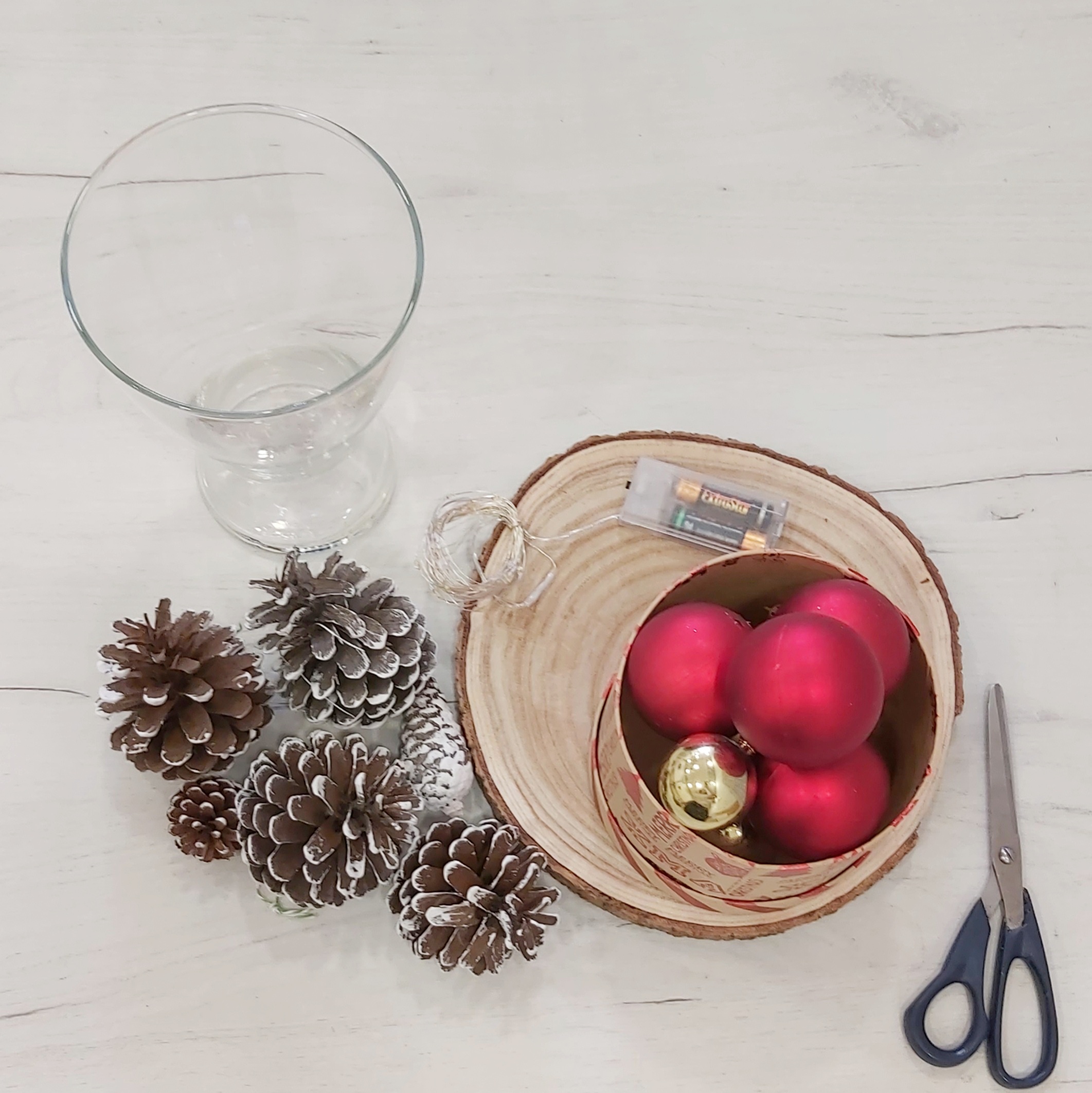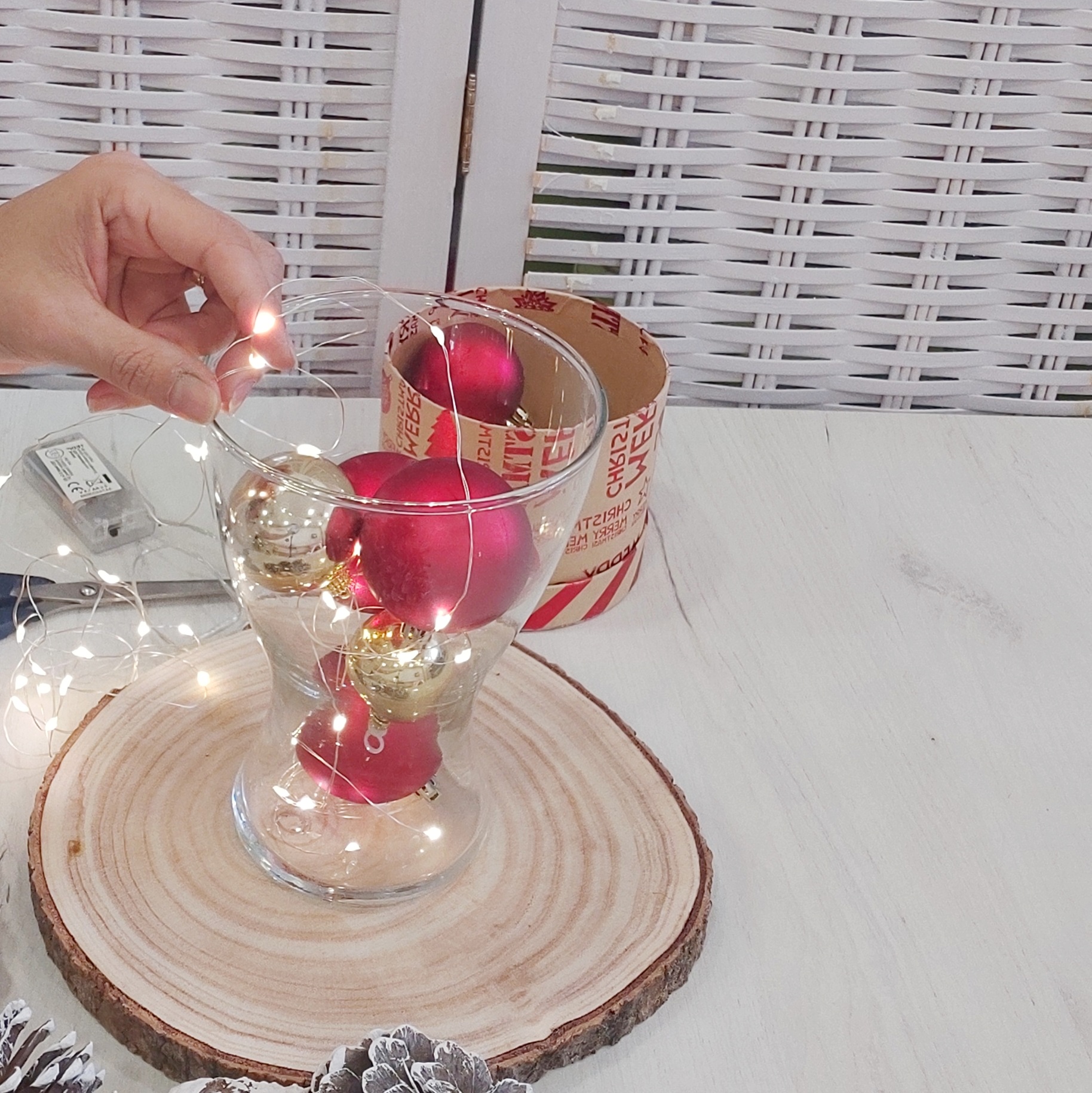 Nuestro primer centro de mesa combina la belleza de las bolas de Navidad y la calidez de las luces LED para crear un ambiente mágico. Aquí tienes lo que necesitarás y los pasos para hacerlo: