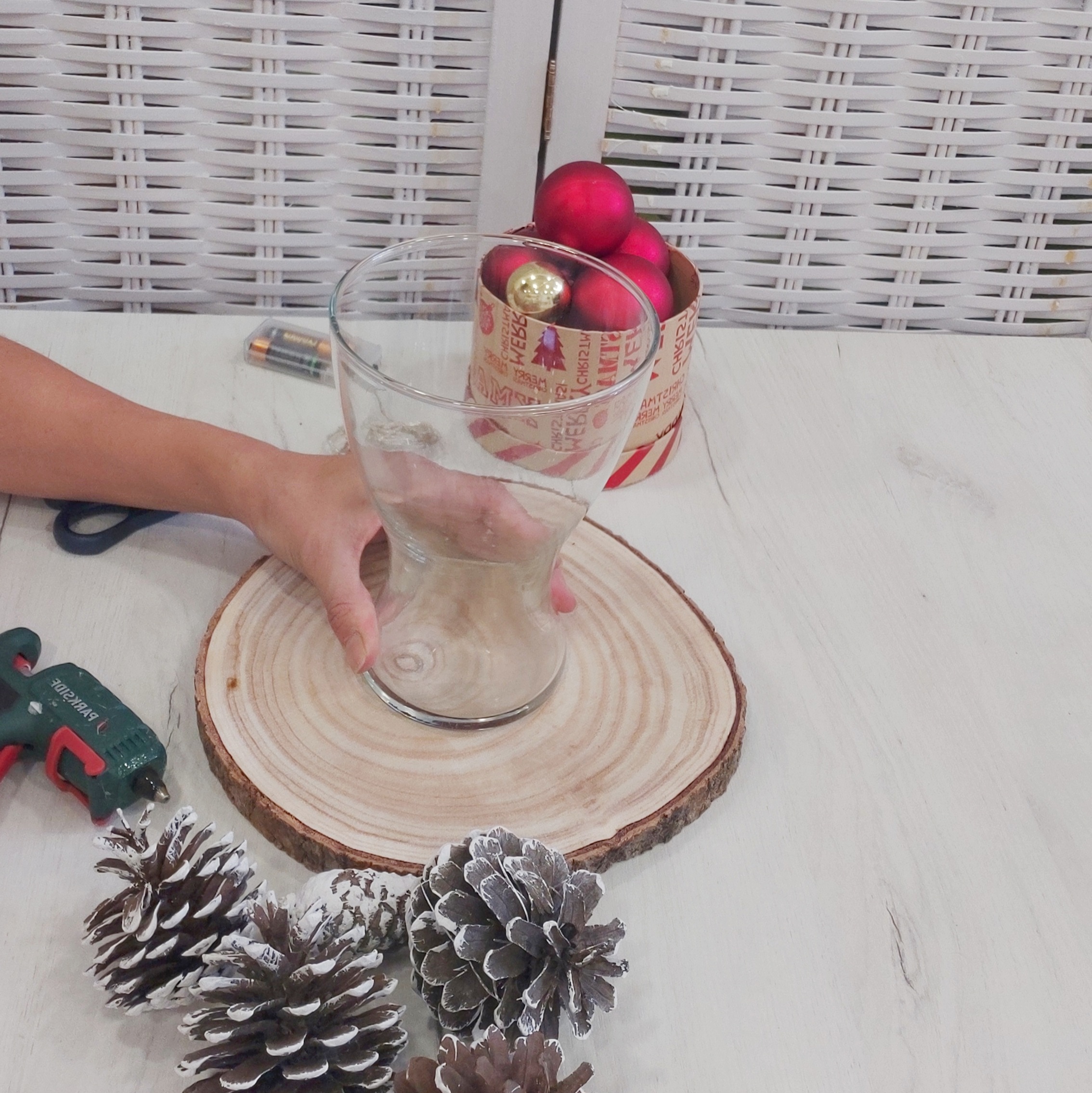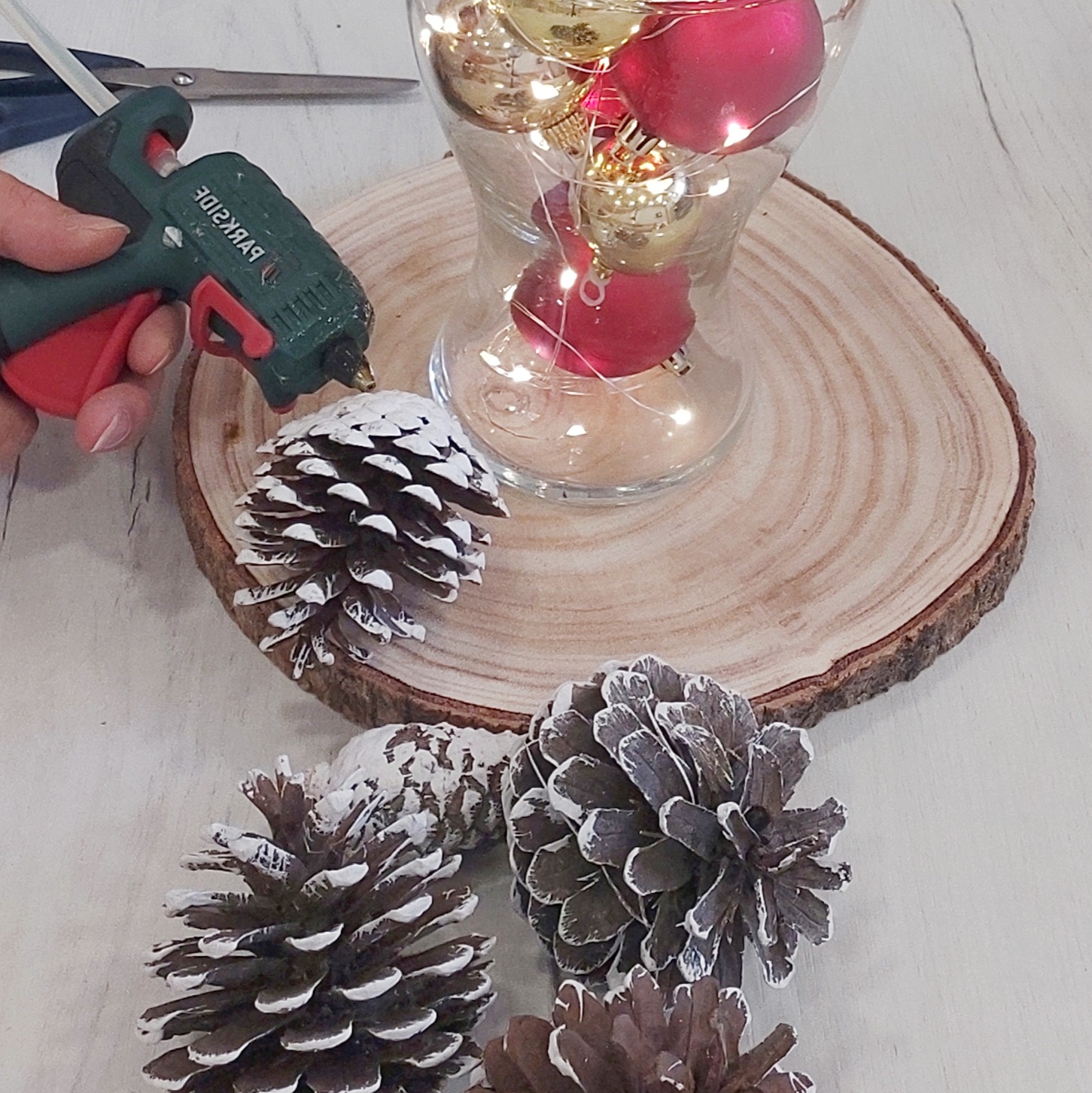 - Paso 4: Por último, usa la pistola de silicona nuevamente para pegar las piñas alrededor del jarrón en la base de madera. Esto añadirá un toque de rusticidad a tu centro de mesa, creando un equilibrio perfecto entre la elegancia y la calidez.