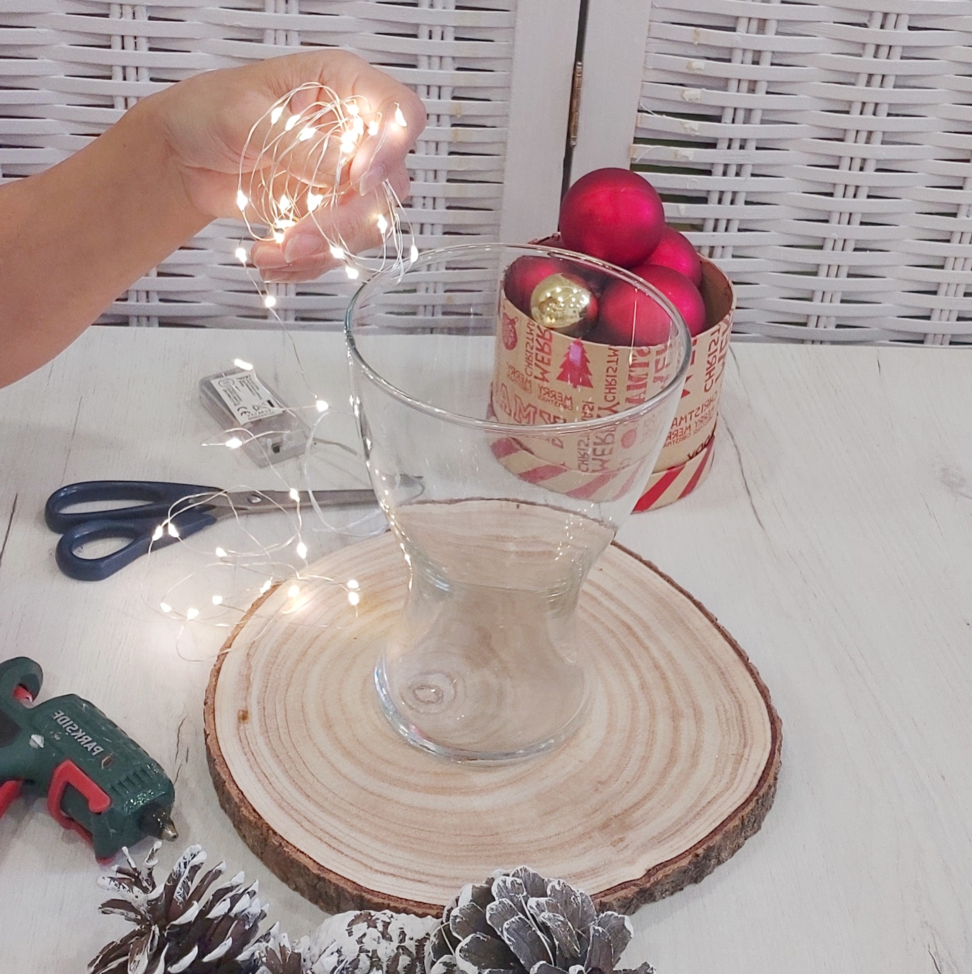 - Paso 2: Ahora, coloca las bolas de Navidad dentro del jarrón. Alterna los colores y tamaños para crear una apariencia equilibrada y llamativa. Intercala las luces LED entre las bolas para un efecto luminoso impresionante.
