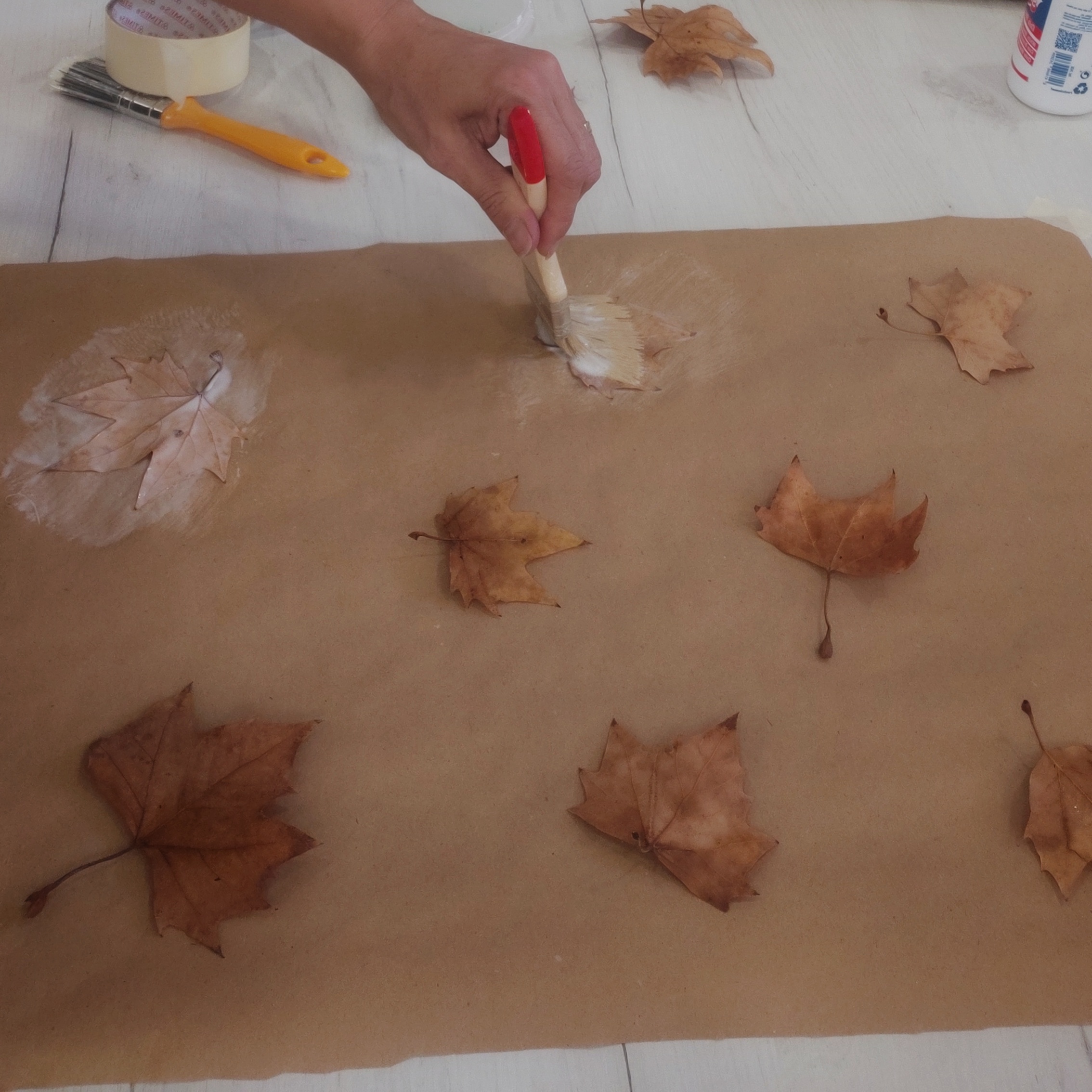 - Comienza a pegar las hojas secas sobre el papel kraft, presionando suavemente para que queden bien adheridas a la cola. Puedes disponerlas en un patrón específico o de manera aleatoria según tu preferencia. Este paso es donde la creatividad fluye.