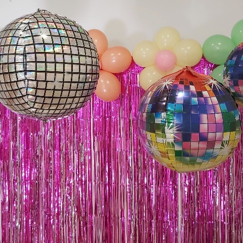 Usa decoración con colores neón, bolas de discoteca y posters de bandas populares de la época.