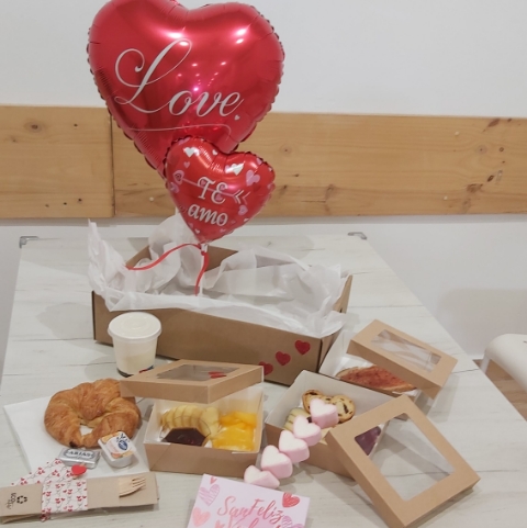 Zumo de naranja, croissants , frutas con chocolate, postre especial de San Valentín….