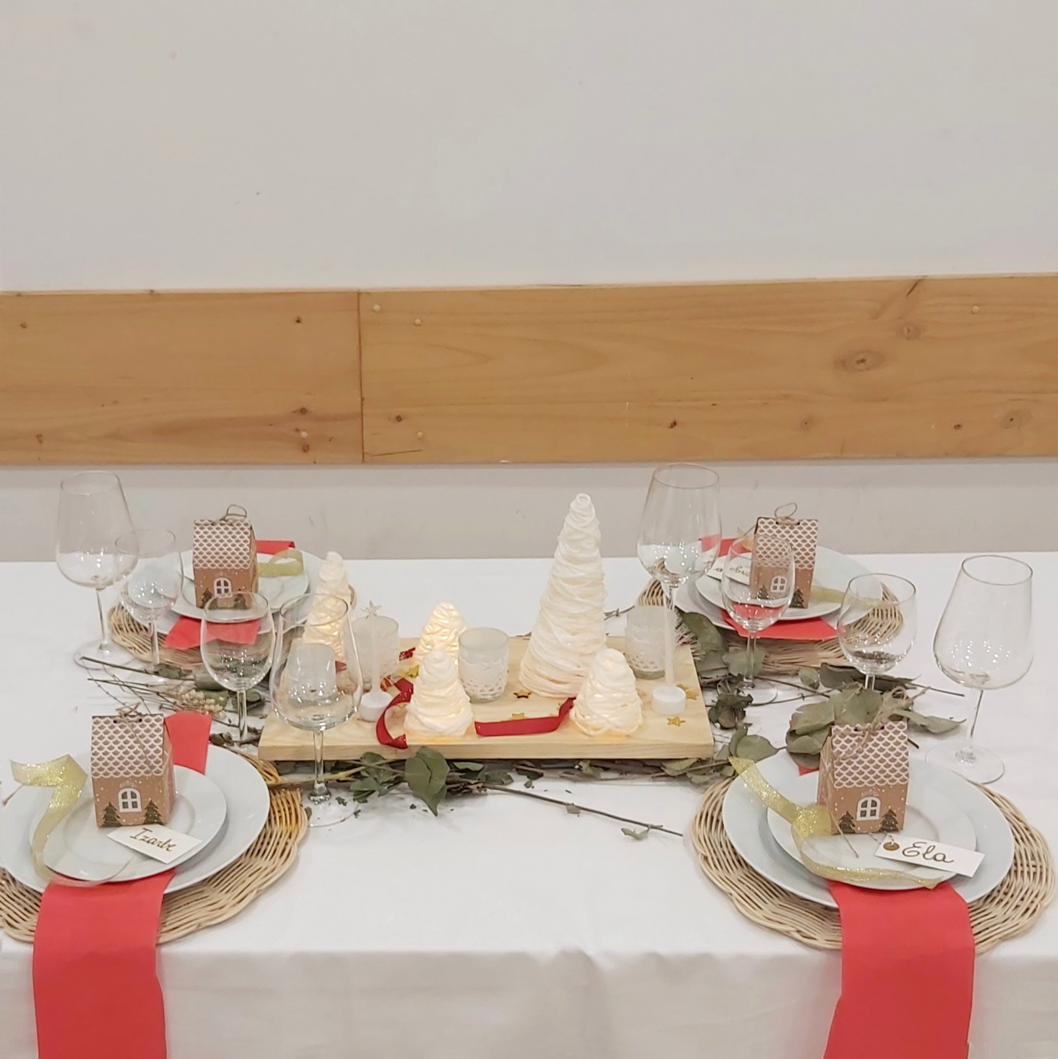 Esta hermosa decoración de mesa combina los colores naturales y cálidos, como el Kraft y el blanco, con toques de rojo.