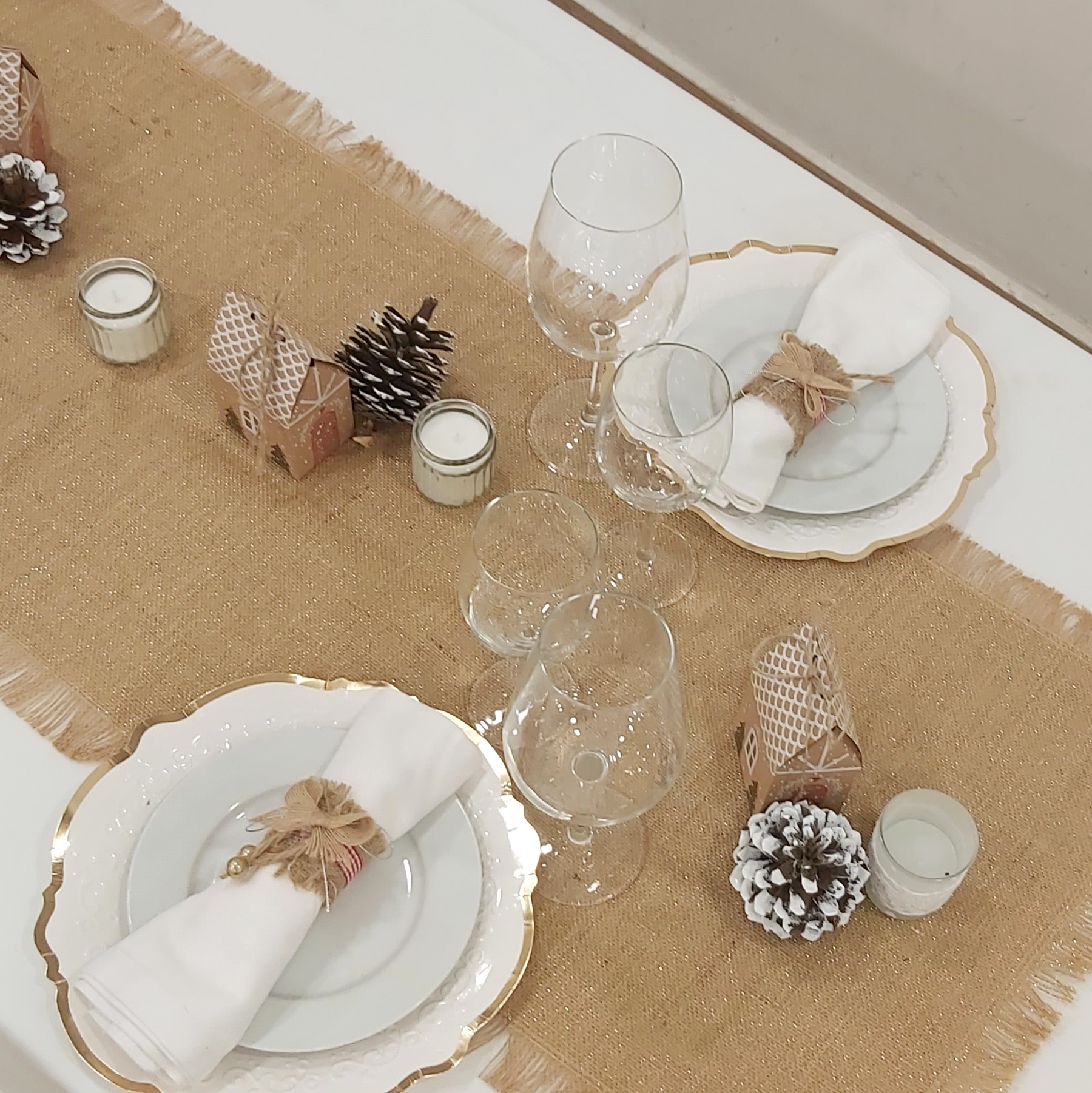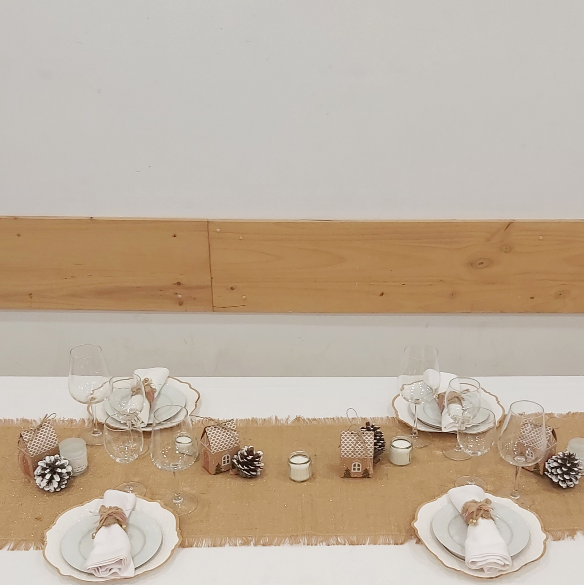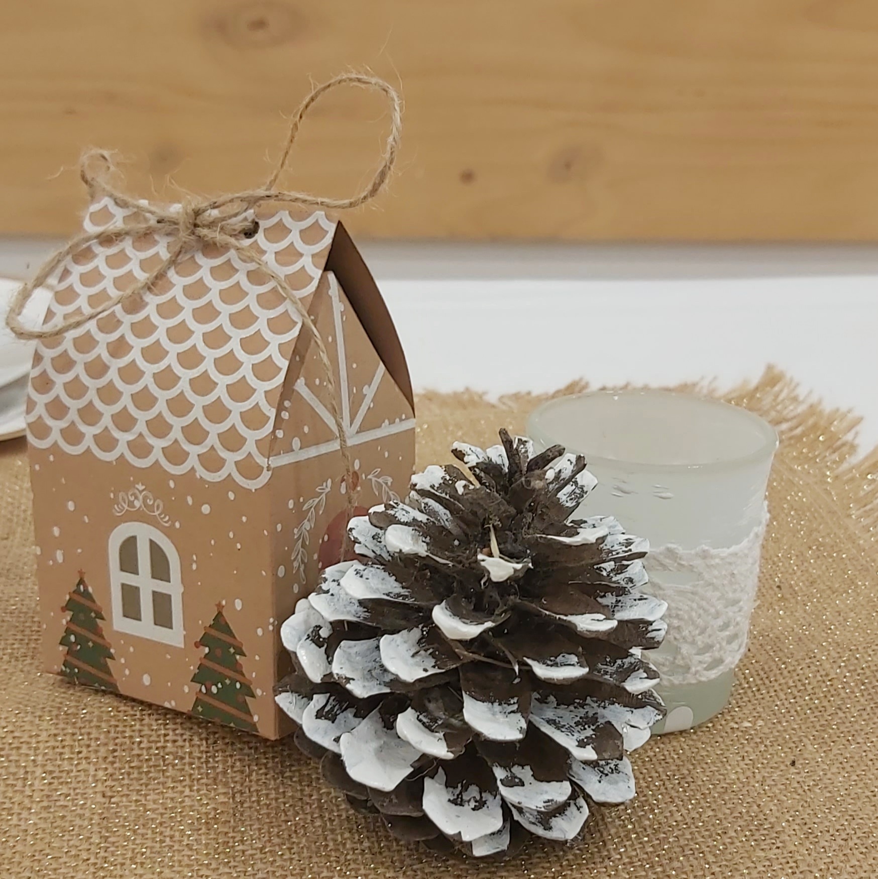 El centro de mesa está adornado con un camino de yute con toques dorados, piñas naturales, y encantadoras casitas Kraft.