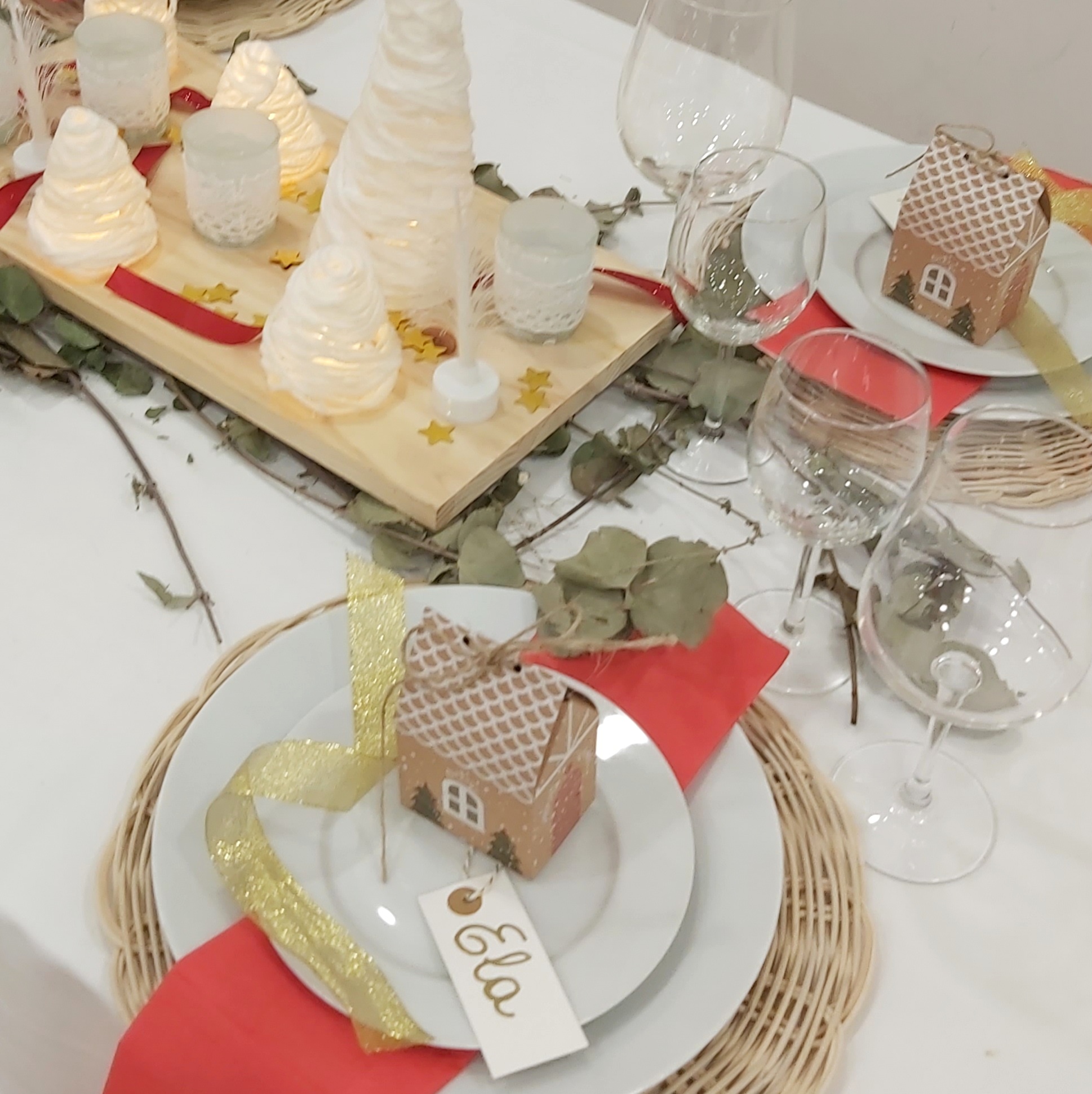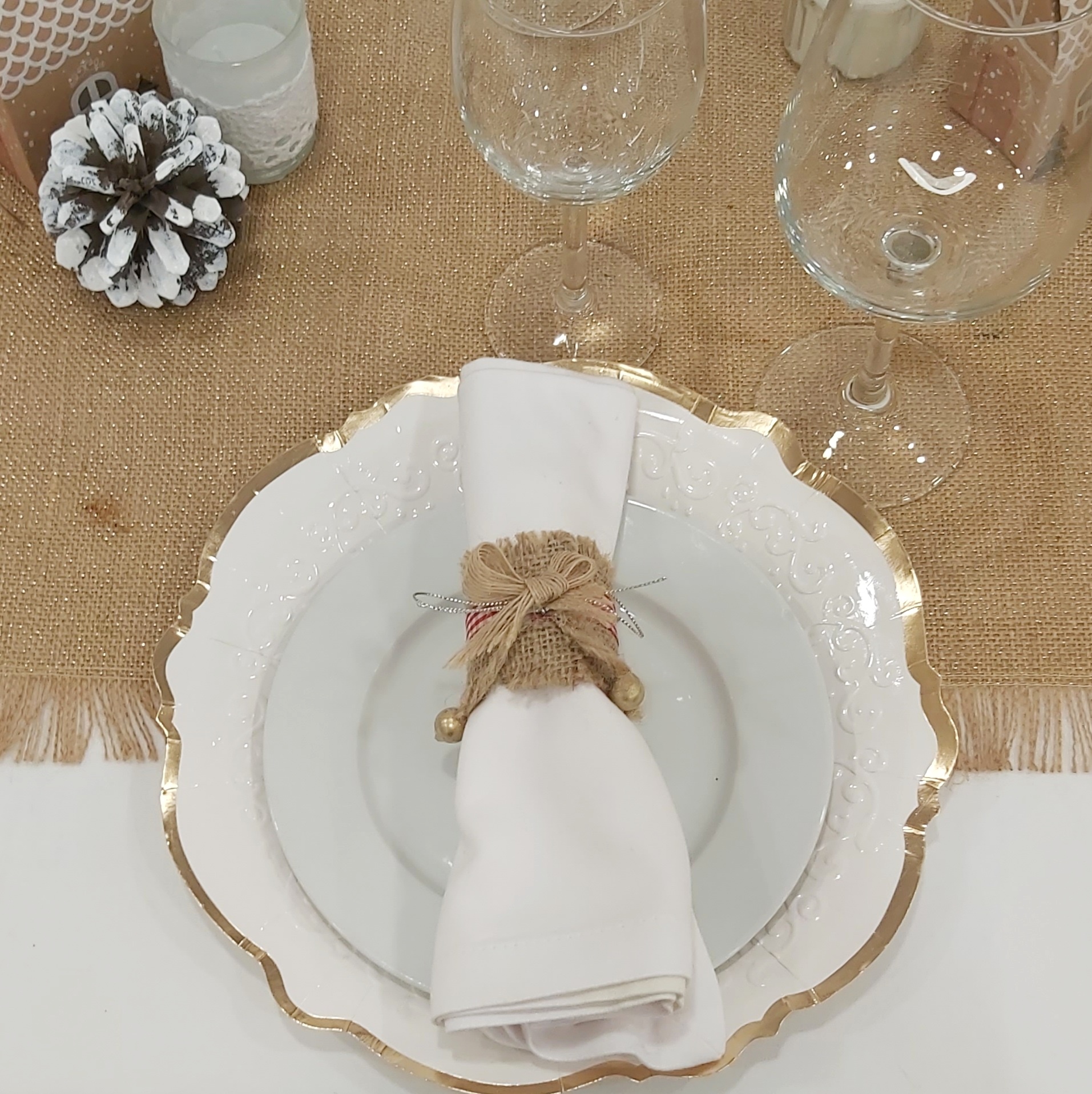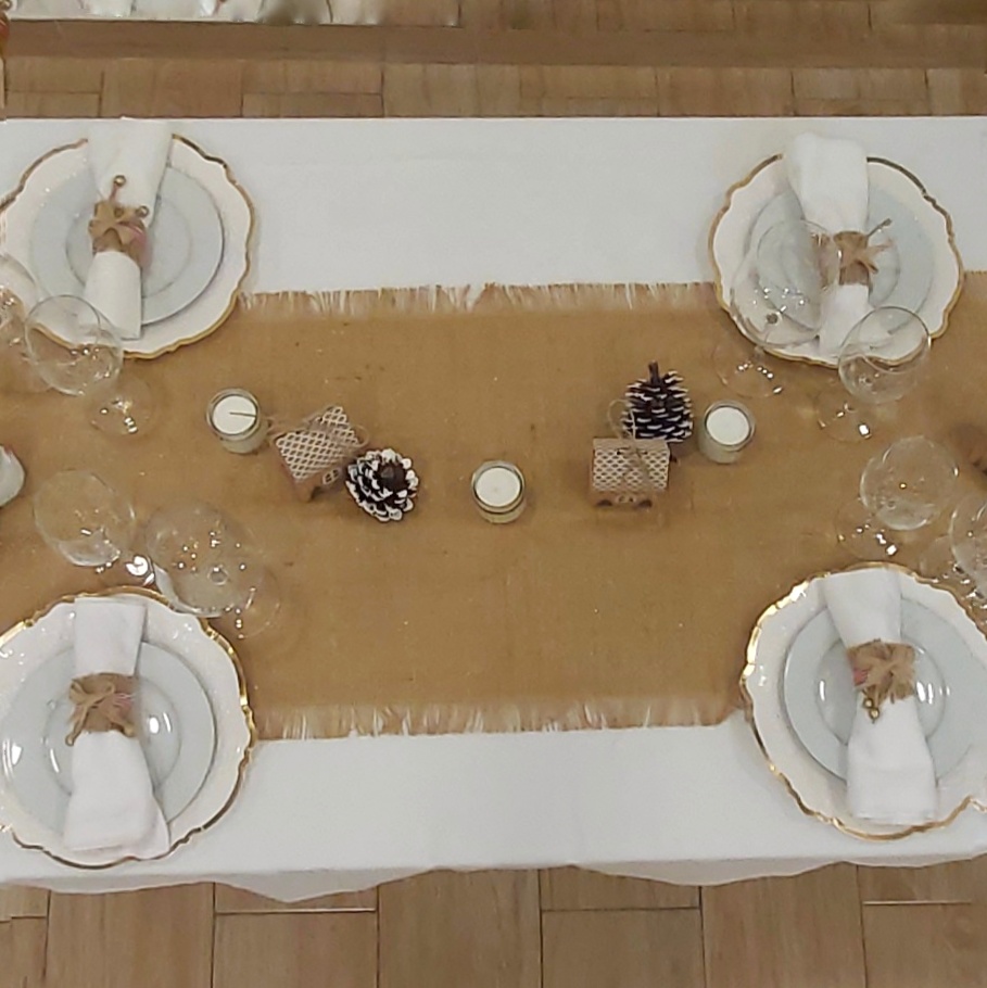 El centro de mesa está adornado con un camino de yute con toques dorados, piñas naturales, y encantadoras casitas Kraft.