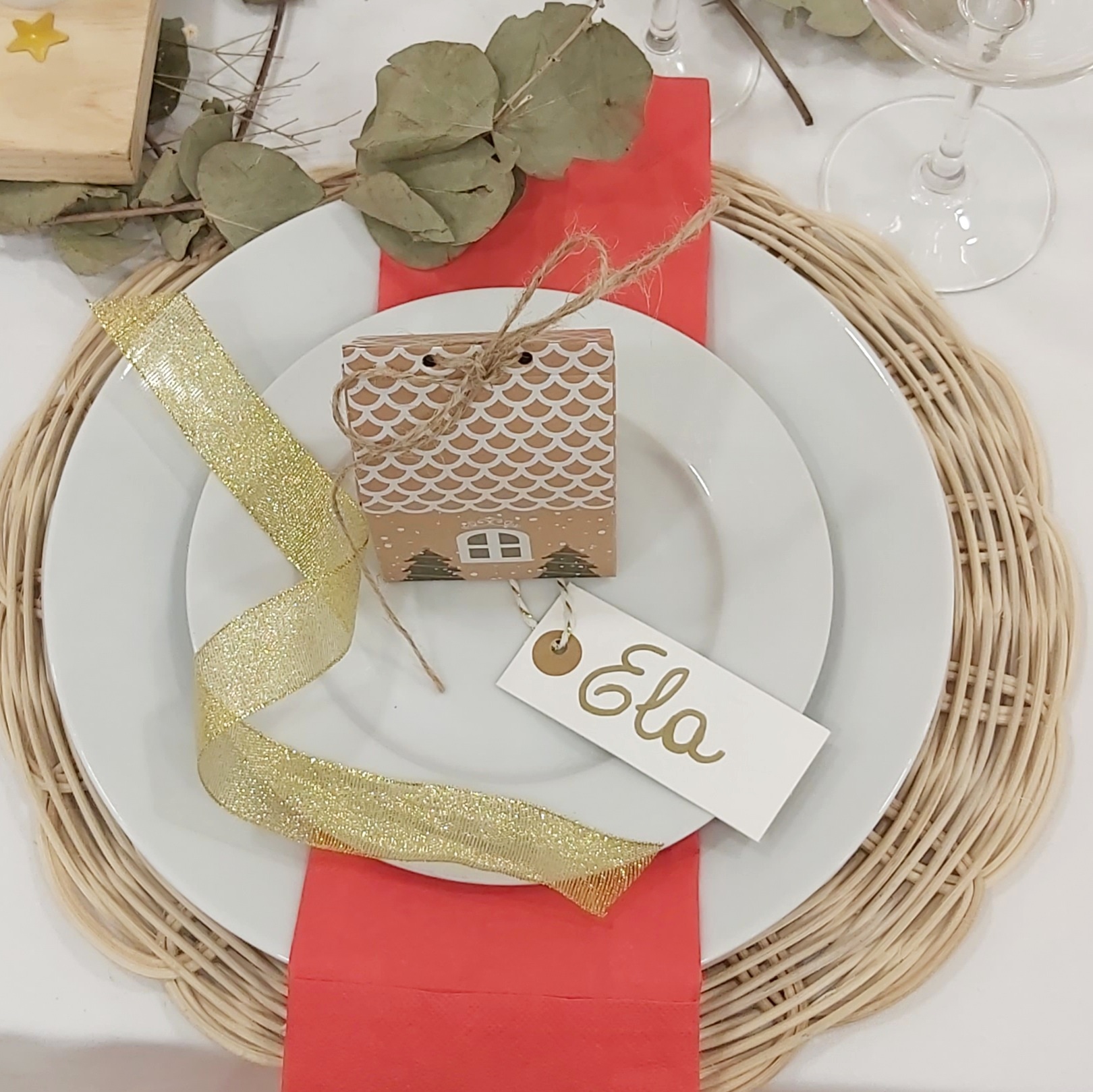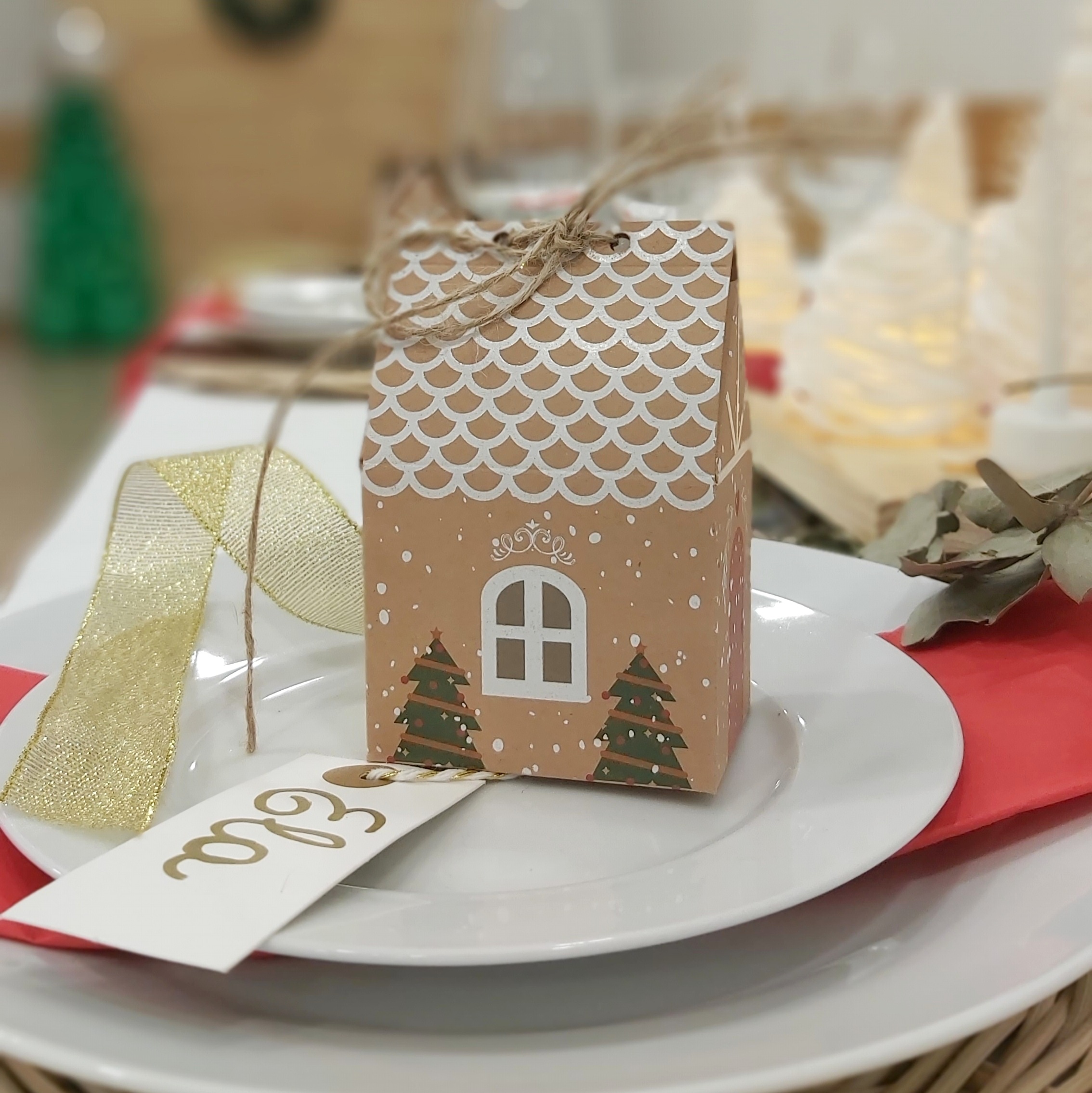 Un detalle encantador es la pequeña cajita en forma de casita Kraft que adorna cada lugar.