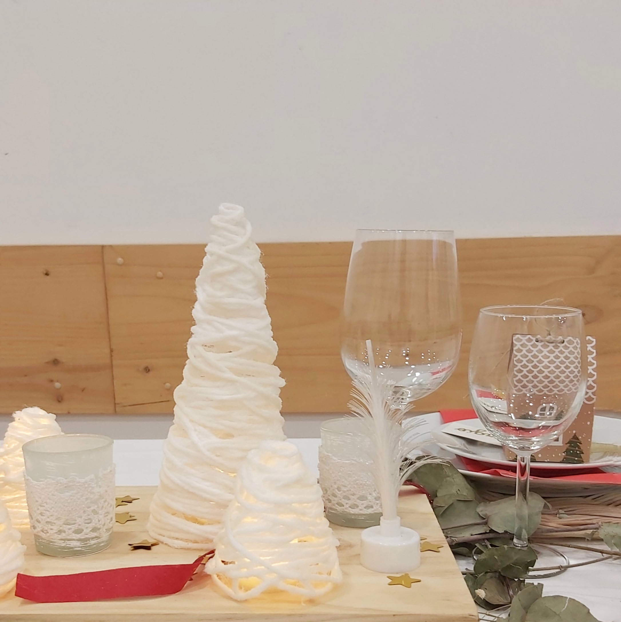 El centro de mesa es una maravillosa combinación de madera natural, ramas secas, velas y los adorables arbolitos de lana creados con el manual anterior.