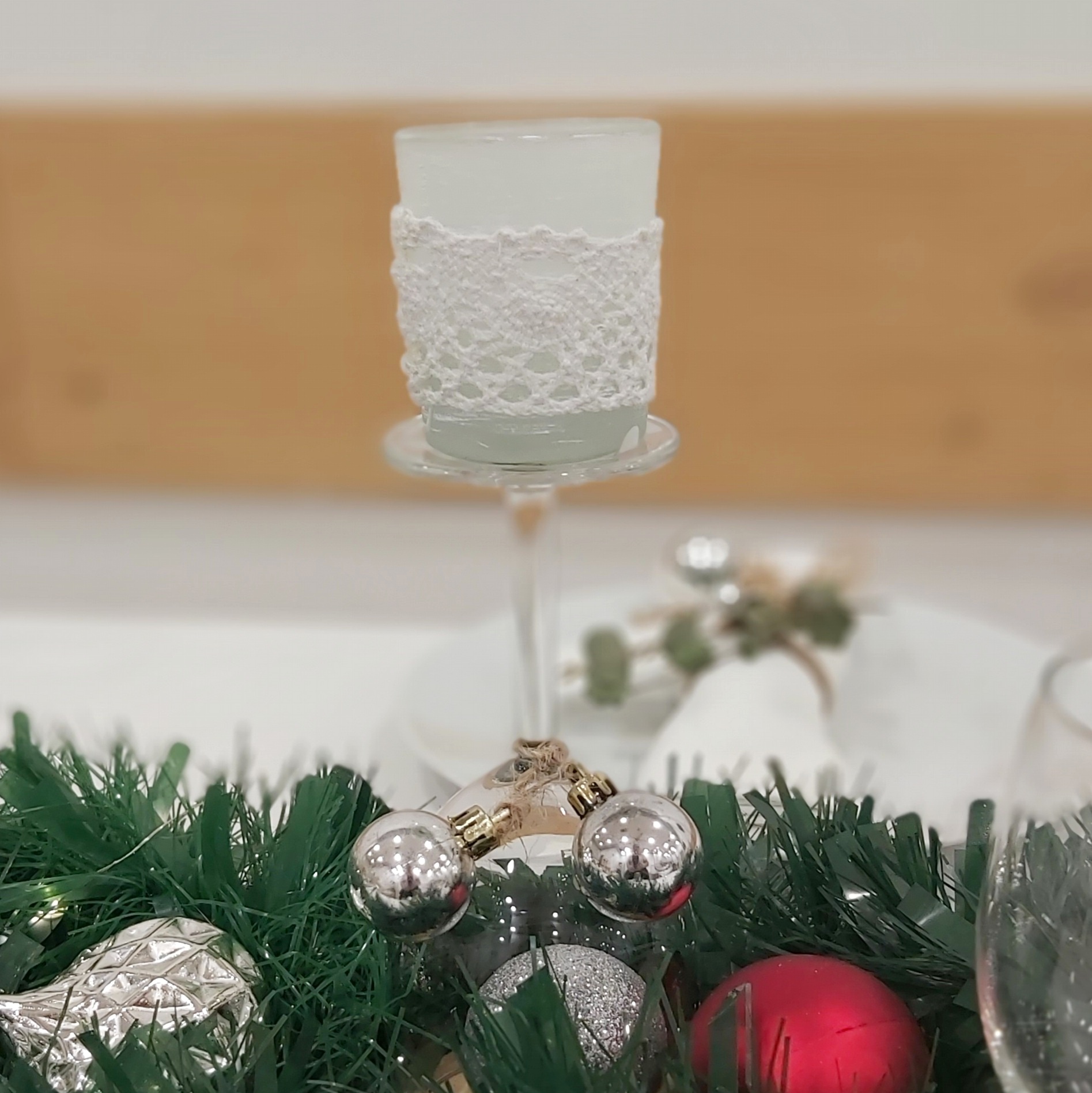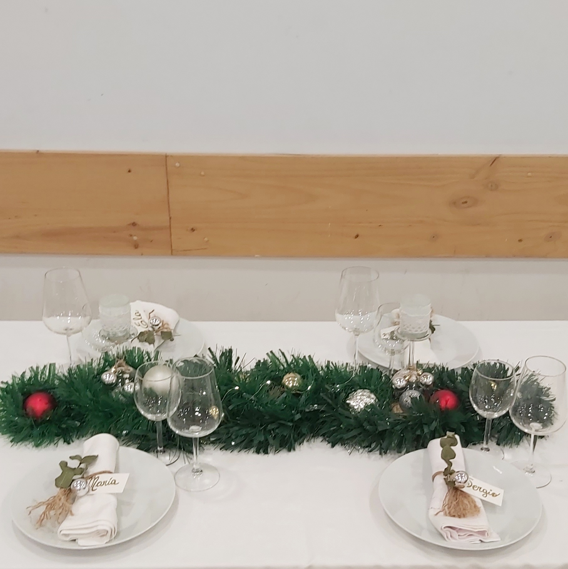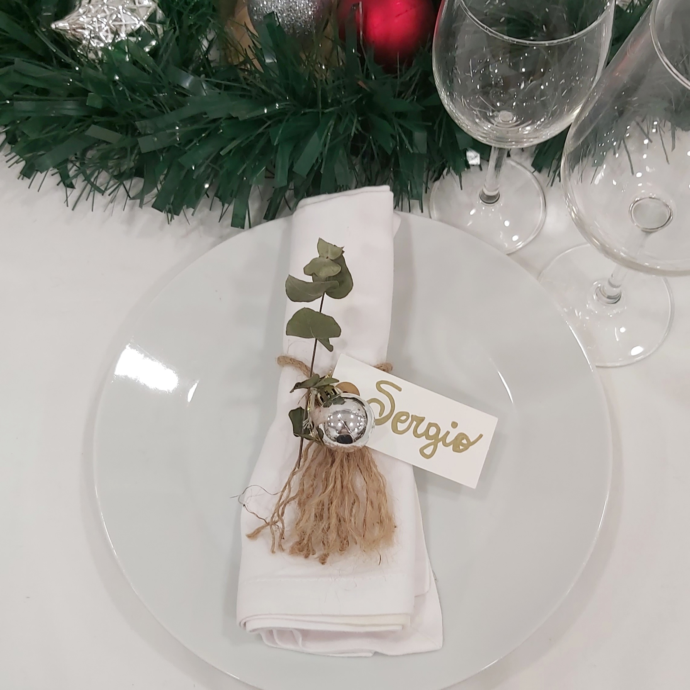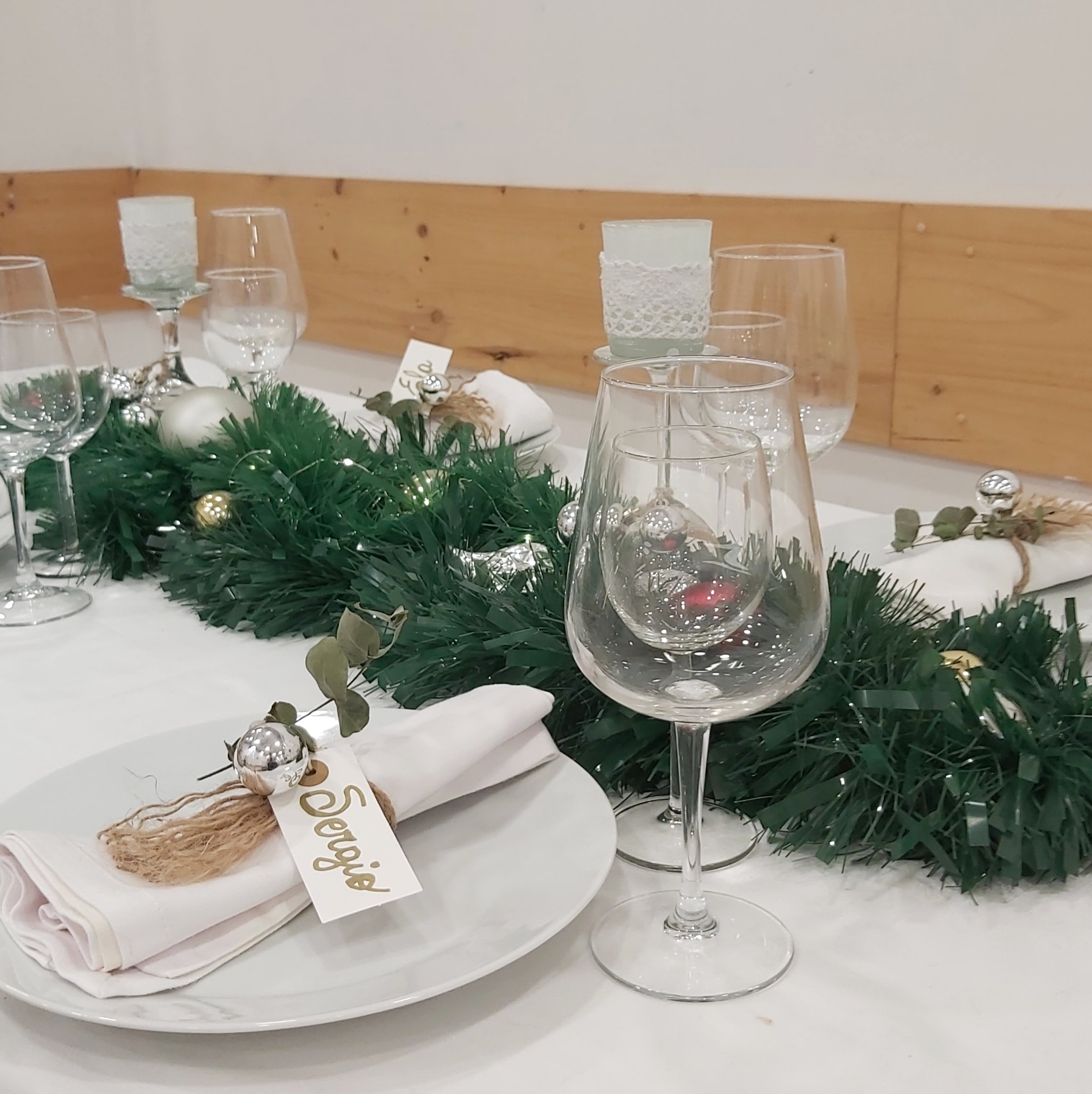 El centro de mesa se convierte en un deslumbrante camino de espumillón adornado con bolas de Navidad. Además, los centros de Navidad que se crearon previamente en este blog para forman parte de la decoración, aportando un toque de autenticidad y calidez a la mesa.
