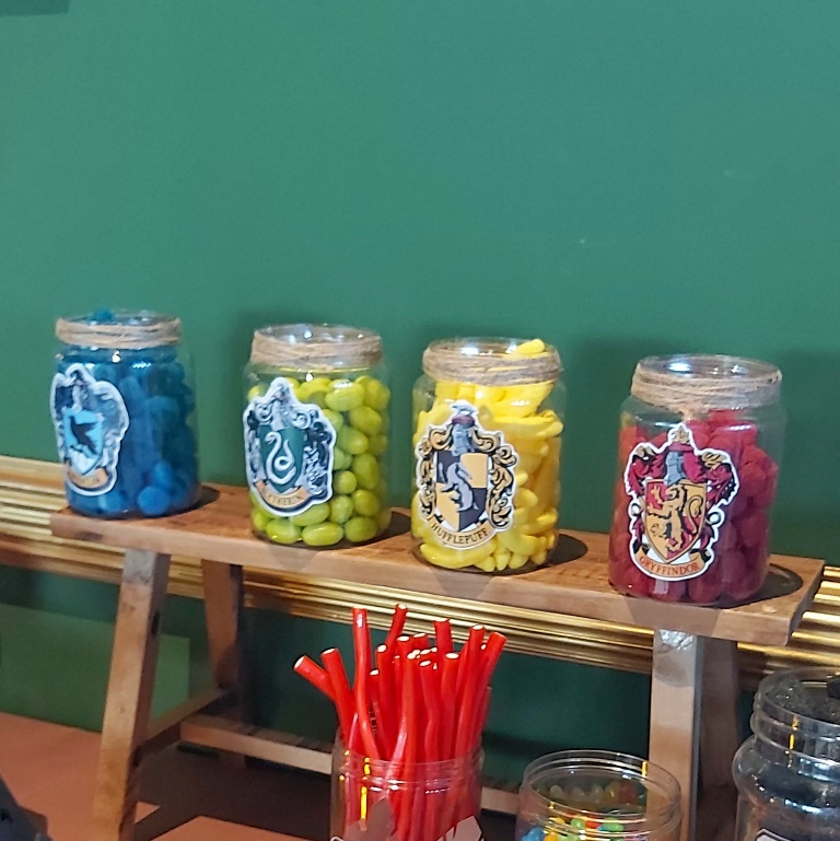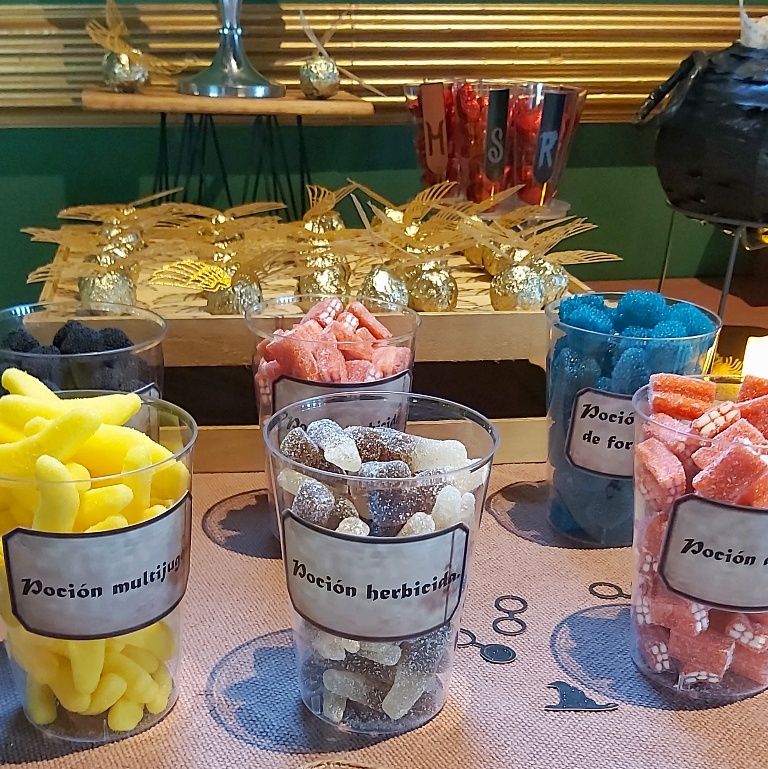 Patricia me dijo que la boda tendría unos 120 invitados, así que necesitaríamos suficientes chuches y golosinas para todos. Además, le recomendé incluir algunos elementos temáticos de «Harry Potter» para darle ese toque mágico que buscaba.