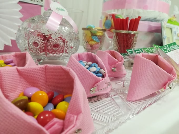 Diseña una mesa de dulces con golosinas y postres que sigan el tema del baby shower. Incorpora elementos como chupetes de azúcar, cupcakes decorados y botellitas rellenas de caramelos, además de los postres que hemos hablado anteriormente.