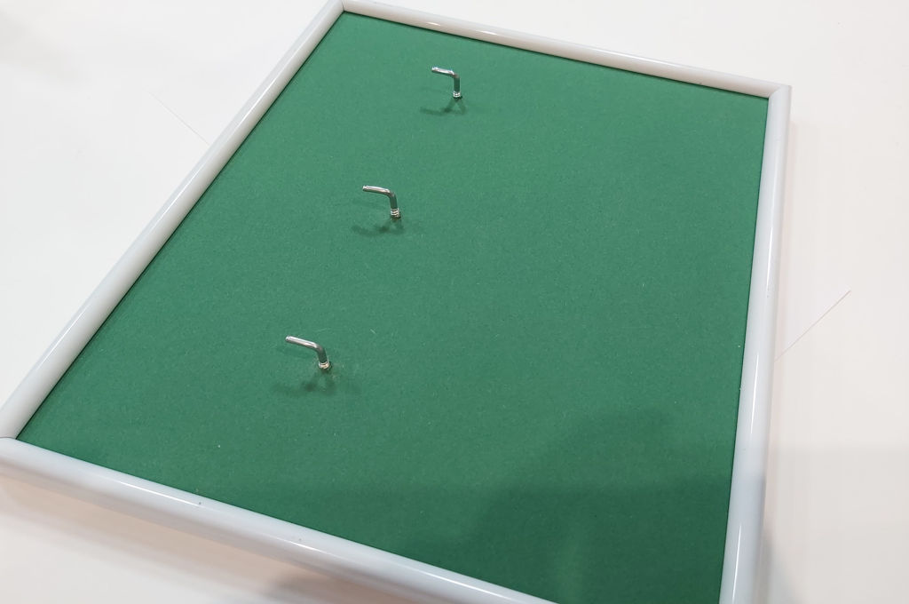 Seguimos pegando el papel que hemos elegido en el marco de foto y le quitamos el cristal (no lo vamos ha utilizar). Lo siguiente será colocar los tres ganchitos.