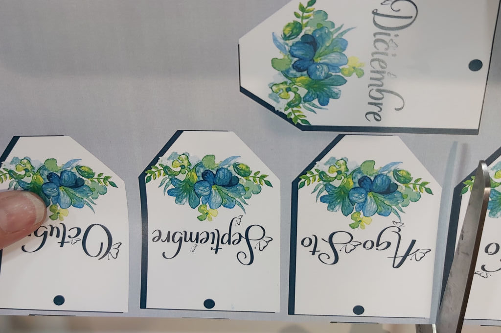 Lo primero es imprimir y recortar los meses y los días que te he enviado. Le haces un agujero con la perforadora.