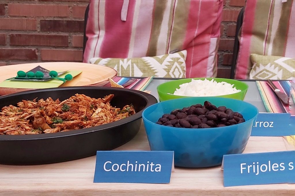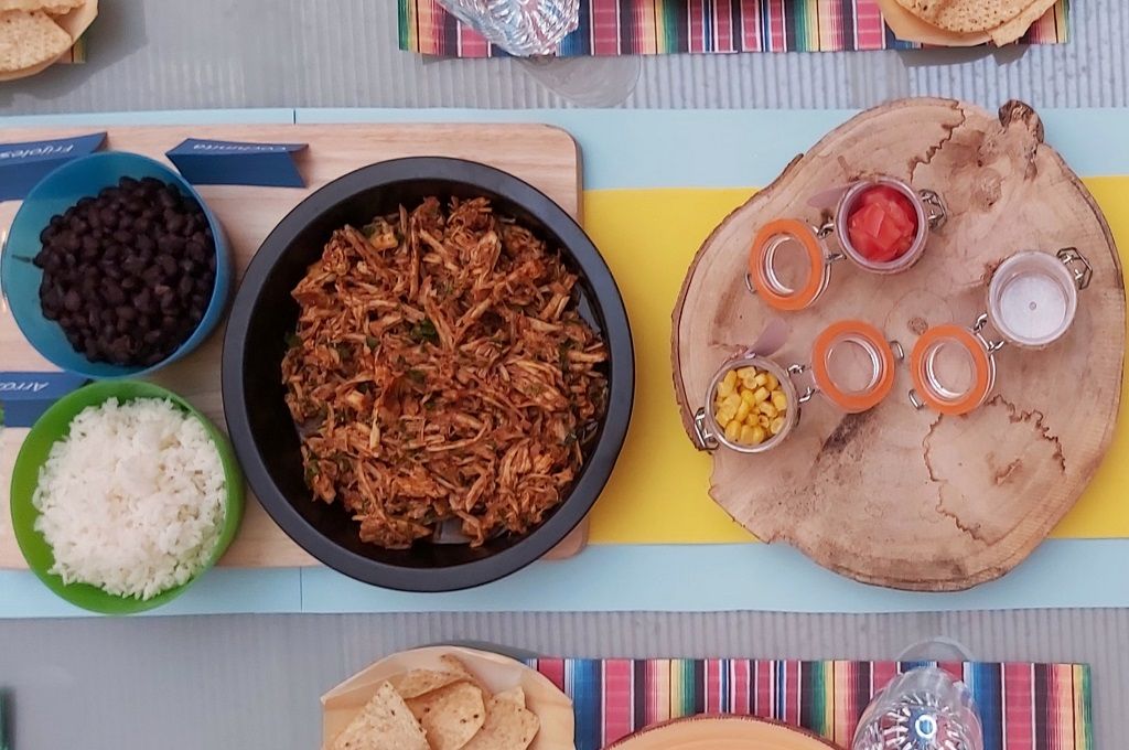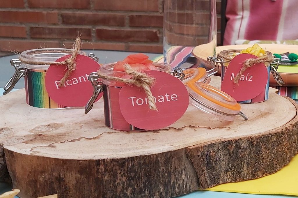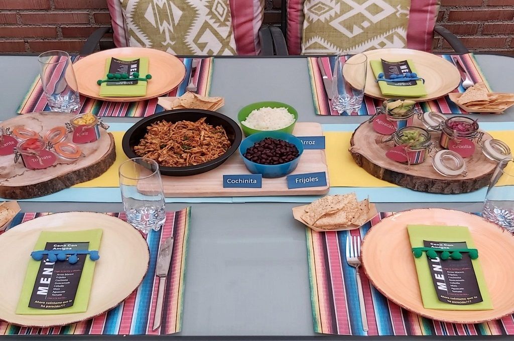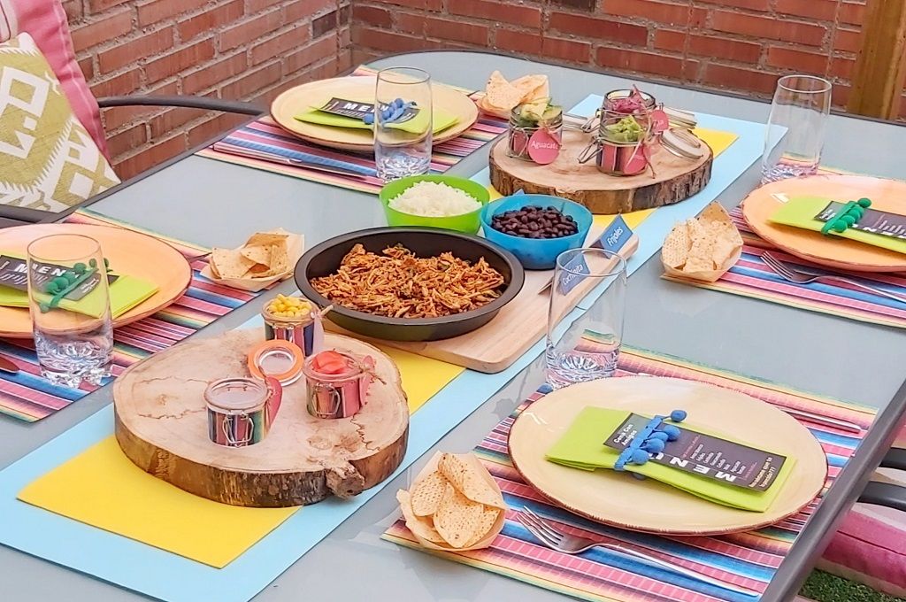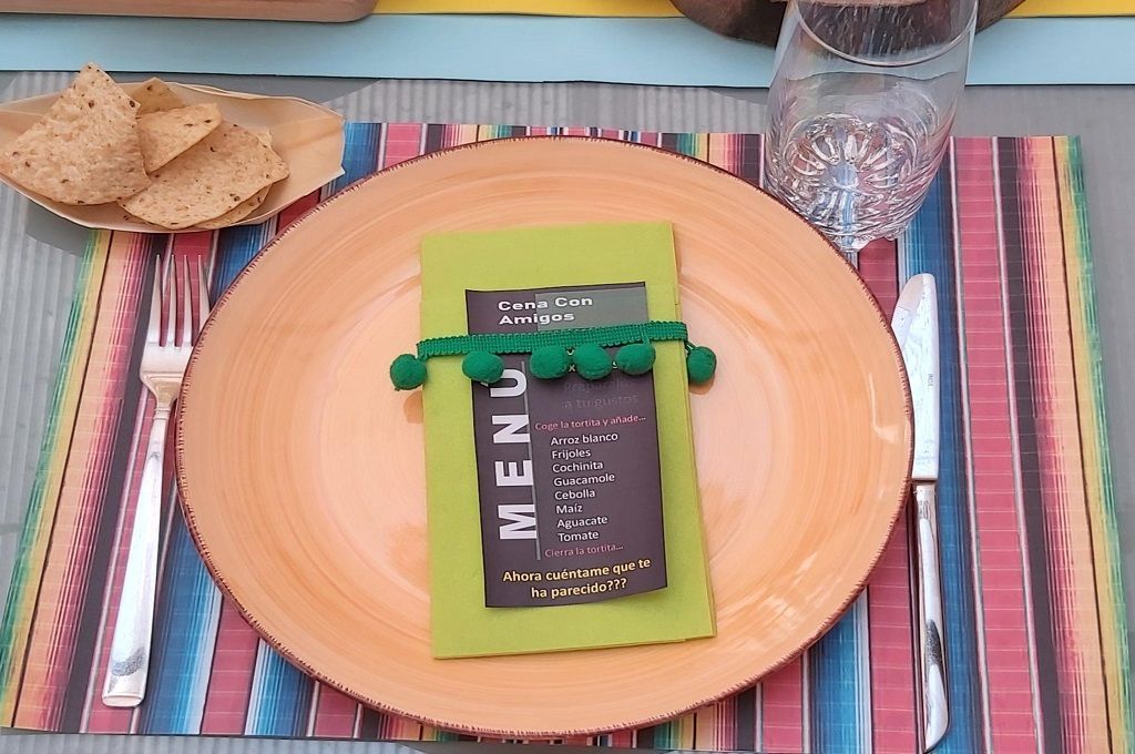 Para decorar los platos hice un kit de papelería bonita para que cada uno supiera lo que había en cada bol,  unos manteles individuales con los colorines mexicanos que tanto me gusta, también preparé unas minutas con los ingredientes del taco mexicano que quedaron muy chulas con una cuerda alrededor de la servilleta y para terminar la mesa coloqué una guirnalda muy mexicana que próximamente te contaré cómo la hice.