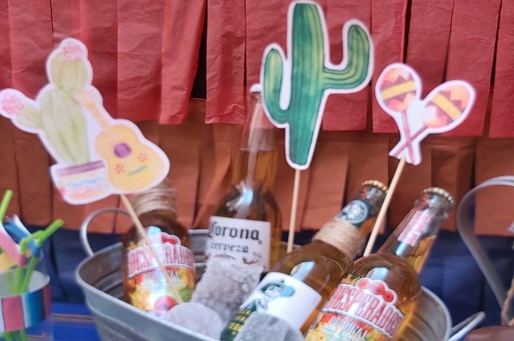 Si, si monte una mesa de bebidas súper bonita, con una trasera de flecos, hice un sombrero para darle toque más México, bebida fría y la  cerveza mexicana Coronita con lima vamos que no faltó nada jajaja