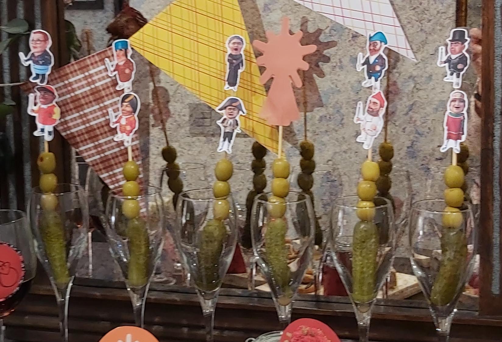 Los cabezudos yo los he puesto con olivas pero puedes pinchar con ellos lo que quieras, o pegarlos en los botes también quedan chulos.