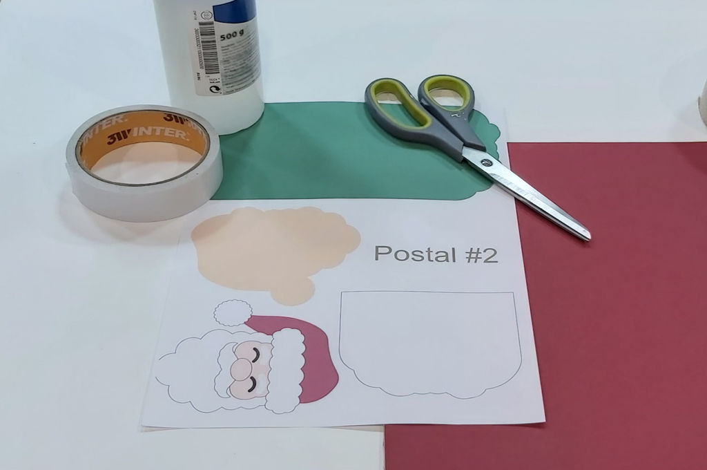 folios impresos, tijeras, pegamento, también puedes utilizar cartulinas de colores y con las caras de Papá Noel que te he mandado puedes preparar postales de varios colores.