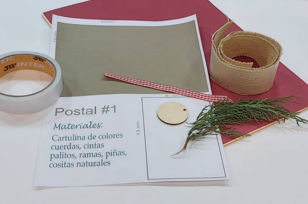 folios impresos, tijeras, decoraciones navideñas, cintas, también puedes utilizar cartulinas de colores y con las plantillas que imprimas las puedes recortar del mismo tamaño. Así tienes postales de varios colores.