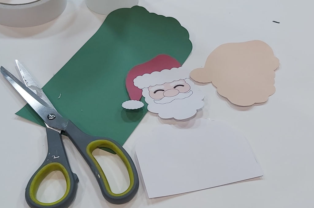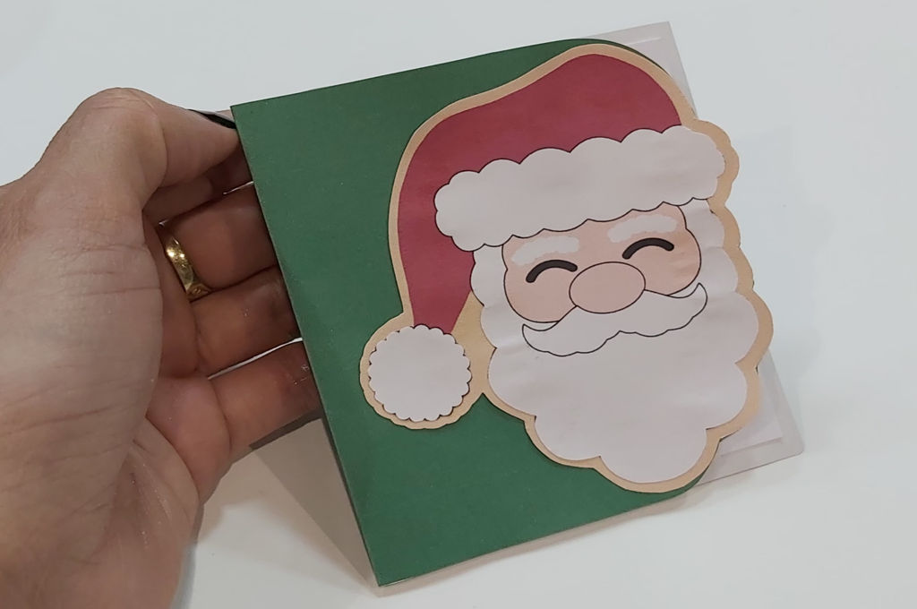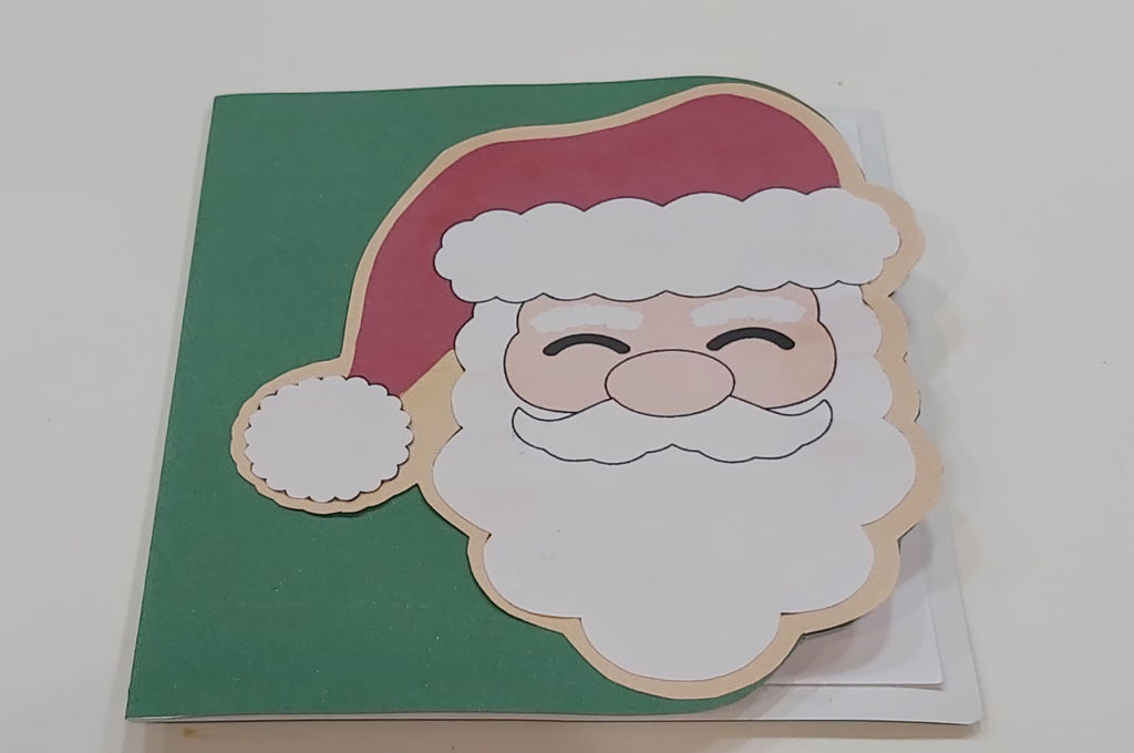 Pegas la silueta y la cara de Papá Noel despues la pegas en la postal lo pliegas por el centro y el otro cuadrado blanco lo pegamos dentro para escribir el mensaje, ahora pegas por fuera la cara de Papá Noel y listo ya lo tienes