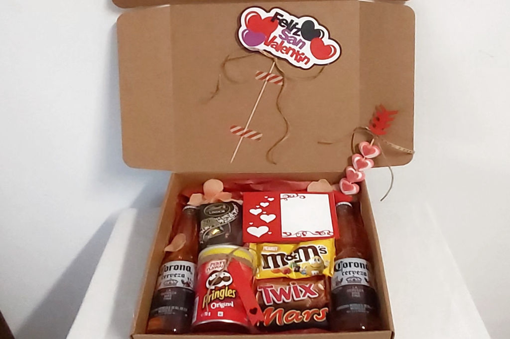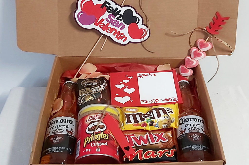 ¿Qué sería de un San Valentín sin chocolates y porque no un par de cervezas para celebrarlo? Eso es lo que lleva esta sorpresa que además irá decorada con tooper Feliz san Valentín y en la postal pondremos el mensaje que tú nos digas, por supuesto la culpable de vuestro flechazo…la flecha dulce del amor para que os endulce aún más vuestro amor en San Valentín.