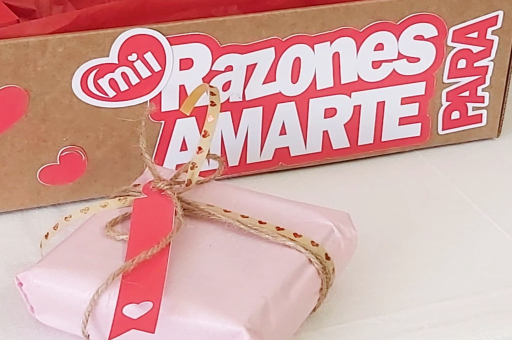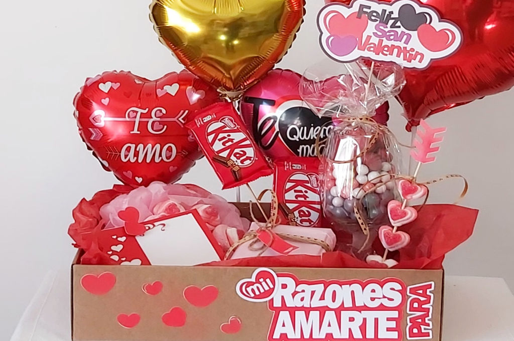 Qué bonita manera de decirle a tu pareja que le quieres con esta frase “Mil Razones para amarte” que irá puesta en la caja bonita y decorada con tooper Feliz san Valentín y globos para dar mucho colorido, en la postal pondremos el mensaje lo que tú nos digas.