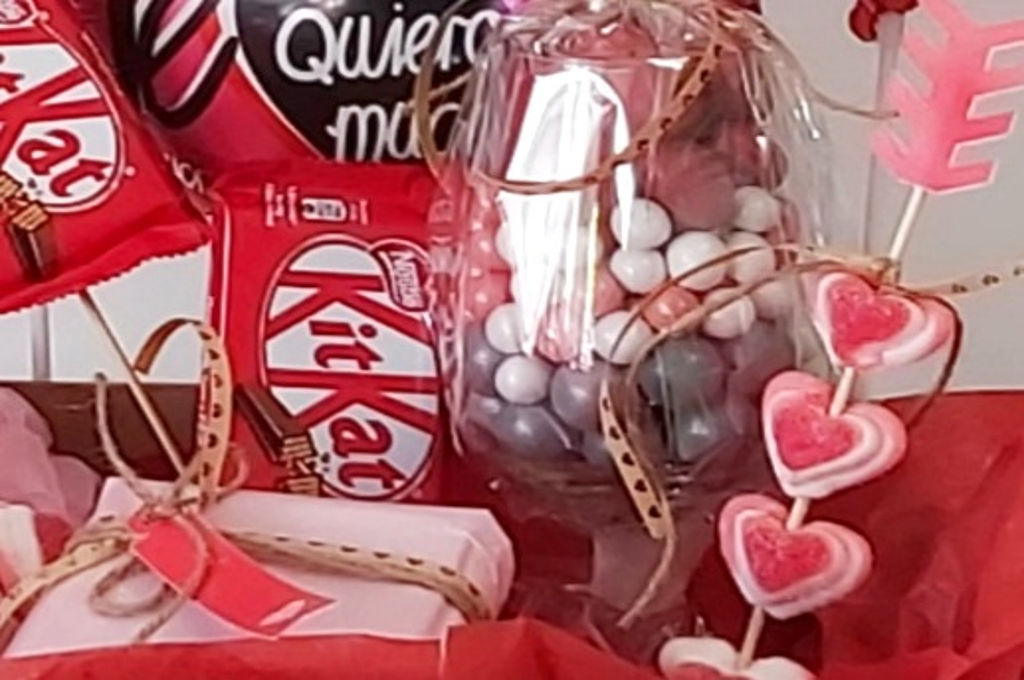Dile a tu pareja cuánto la quieres con este regalo personalizado que irá puesta en la caja bonita y decorada con tooper Feliz san Valentín y globos para dar mucho colorido en la postal pondremos el mensaje que tú nos digas.