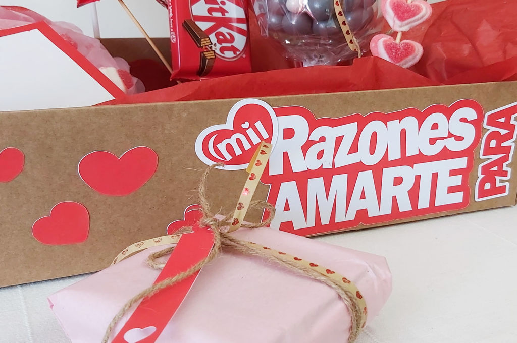 Qué bonita manera de decirle a tu pareja que le quieres con esta frase “Mil Razones para amarte” que irá puesta en la caja bonita y decorada con tooper Feliz san Valentín y globos para dar mucho colorido,  en la postal pondremos el mensaje lo que tú nos digas.